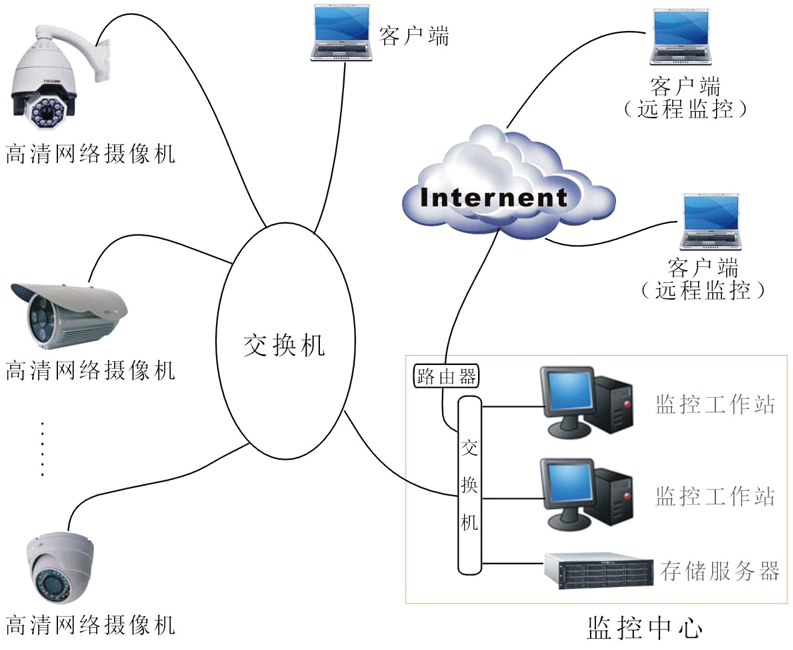 【监控工作站】用于对摄像机传输过来的图像进行显示,检索与回放【存储服务器】中的录像资料。