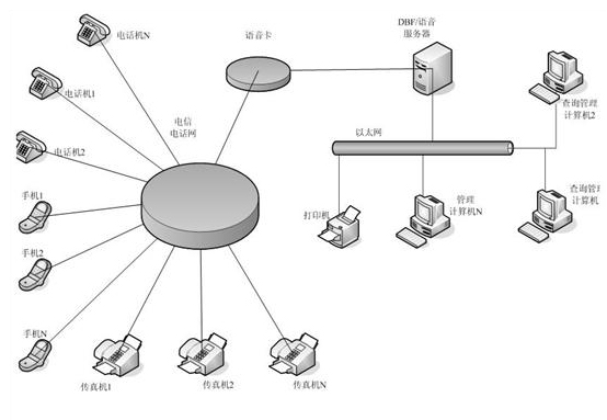 系统中由数据库语音服务器、管理计算机、打印机、电话语音卡组成。