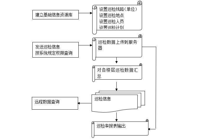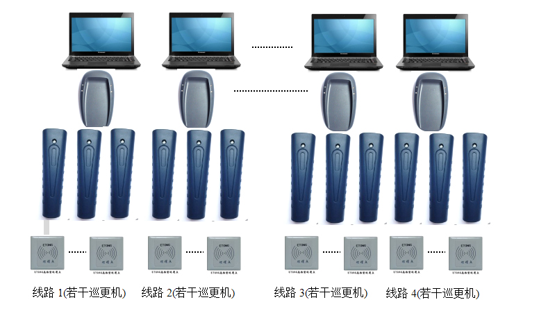 本项目采用离线式感应电子巡更系统。其工作原理是应用RFID技术,采用低频电子标签做为巡逻地址信息钮安装在巡逻的楼层、线路等关键检查点处,保安人员在巡查时携带数据采集器读取安装在楼层、线路上的巡更地址钮,数据采集器即时记录下巡逻人员到达的地点和巡查时间。由管理人员定期将巡更记录通过数据传输座上传到计算机中,运行专用的巡检管理系统软件,就可以通过计算机方便快速地查询到保安人员巡逻记录,并提示出漏检、误点信息,统计打印输出各种报表。