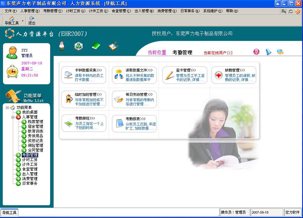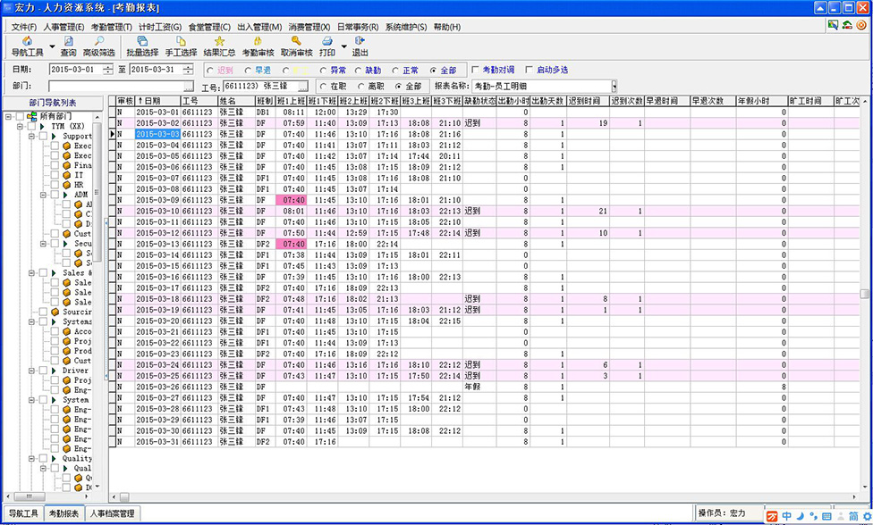 考勤管理用于企业员工出勤管理,它是依据企业的考勤管理制度对比员工上下班时的打卡时间、卡号、机号等原始数据,通过筛选、对比、分析得出管理者所需要的员工出勤的各种数据及报表。本软件在功能上有很多创新和突破,实现了考勤类别由用户自定义、考勤管理制度由用户自定义、作息时间(班制)完全由用户自定义、单个排班和批量排班、模糊排班、设置部门默认班制和自动找班,编辑方便、灵活快捷等功能。并解决了跨零点、跨24小小(天)、跨月的考勤统计难题。